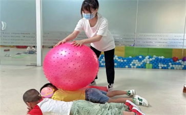 用小刺球在孩子身上不同部位進(jìn)行來回滾動(dòng)或輕壓,四肢和前胸可由孩子自己完成,后背則由訓(xùn)練人員輔助進(jìn)行。也可以采用坐、推、壓大籠球、俯仰臥等方式增加身體按摩。