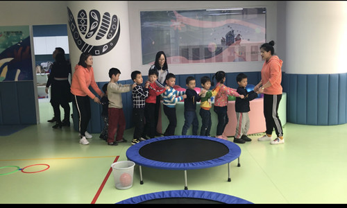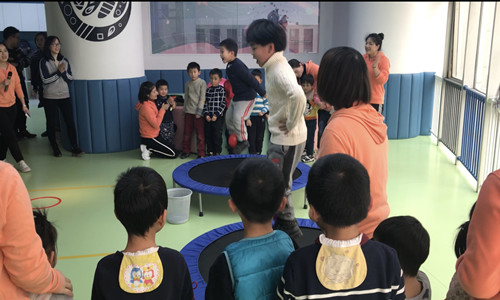 小朋友們先在跳床上跳高,然后跳圓圈,最后到到終點(diǎn)穿一顆珠子,哪一隊(duì)先珠子穿的最多就是獲勝小組。