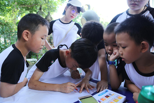 第四天, 孩子們都轉(zhuǎn)身投入自然的懷抱,在樹叢中探索大自然的奧妙,采摘奇特的樹葉,了解萬物神奇之處,完成屬于自己獨一無二的畫作。