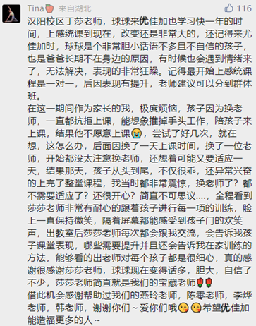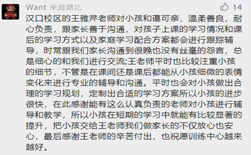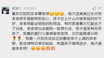 除了訓(xùn)練上的用心,日常生活中也無微不至的幫助家長和孩子,用真心換真心,小朋友們都是迫不及待要上湯老師的課,家長們都從心底里感謝這樣的老師!