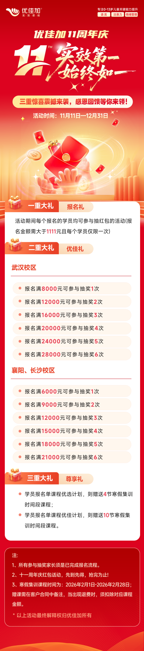 為感恩11年來萬千家庭的信任與陪伴,也為了讓更多孩子體驗到專業(yè)感統(tǒng)教育的獨特價值,值此意義非凡的周年慶之際,我們特別準(zhǔn)備了誠意十足的回饋活動: