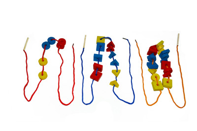 游戲玩法:準(zhǔn)備各種顏色的小木珠十幾顆和兩根細(xì)繩。媽媽先穿好一串相同顏色珠子,讓孩子模仿,引導(dǎo)孩子穿出一串相同顏色的珠子。