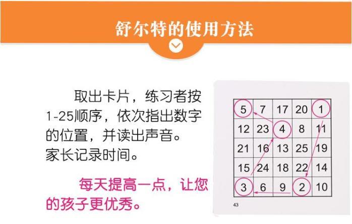2、舒特爾圖:學生快速轉動眼球,按照順序把數(shù)字從1-25找出來,這可以鍛煉學生眼球的追隨運動,提高視覺廣度,從而提升閱讀速度。